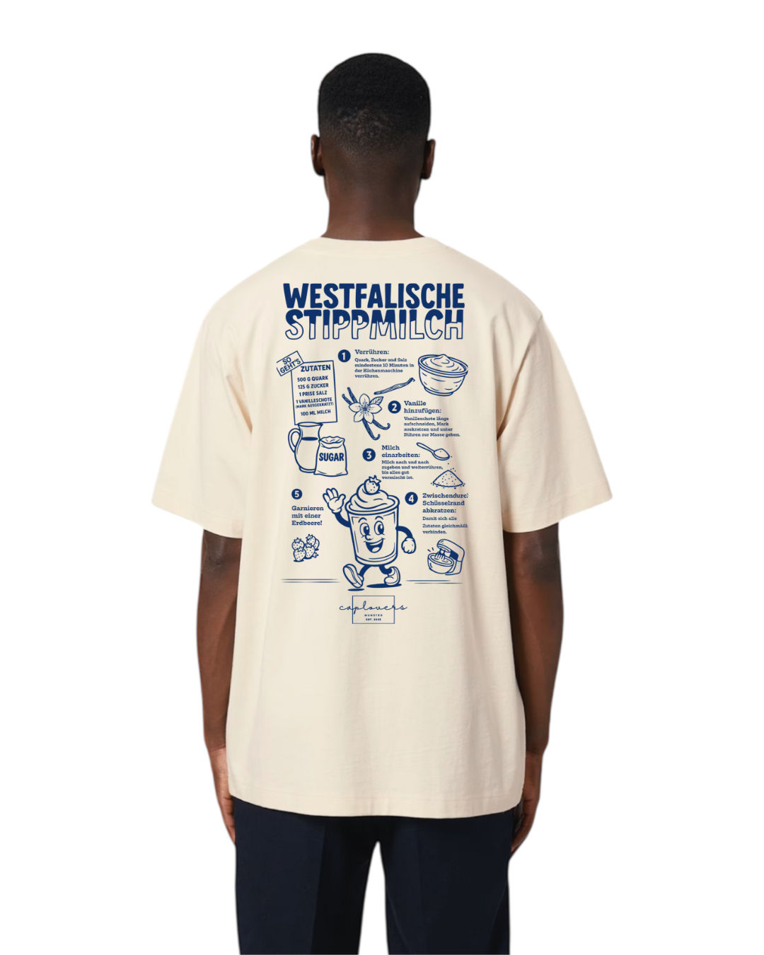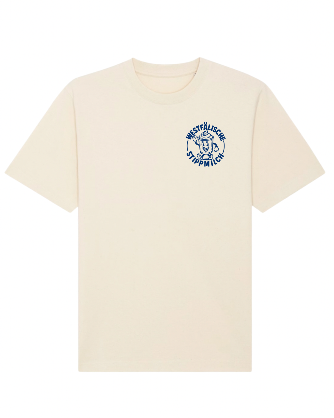 Vorderseite: der linke Brustbereich wird durch ein kleines Stippmilch Glas als Cartoon Figur sowie dem Schriftzug "Westfälische Stippmilch" geziert.